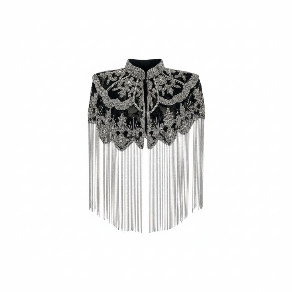 Beaded Shawl w/collar – 24″ tassel Black/Silver