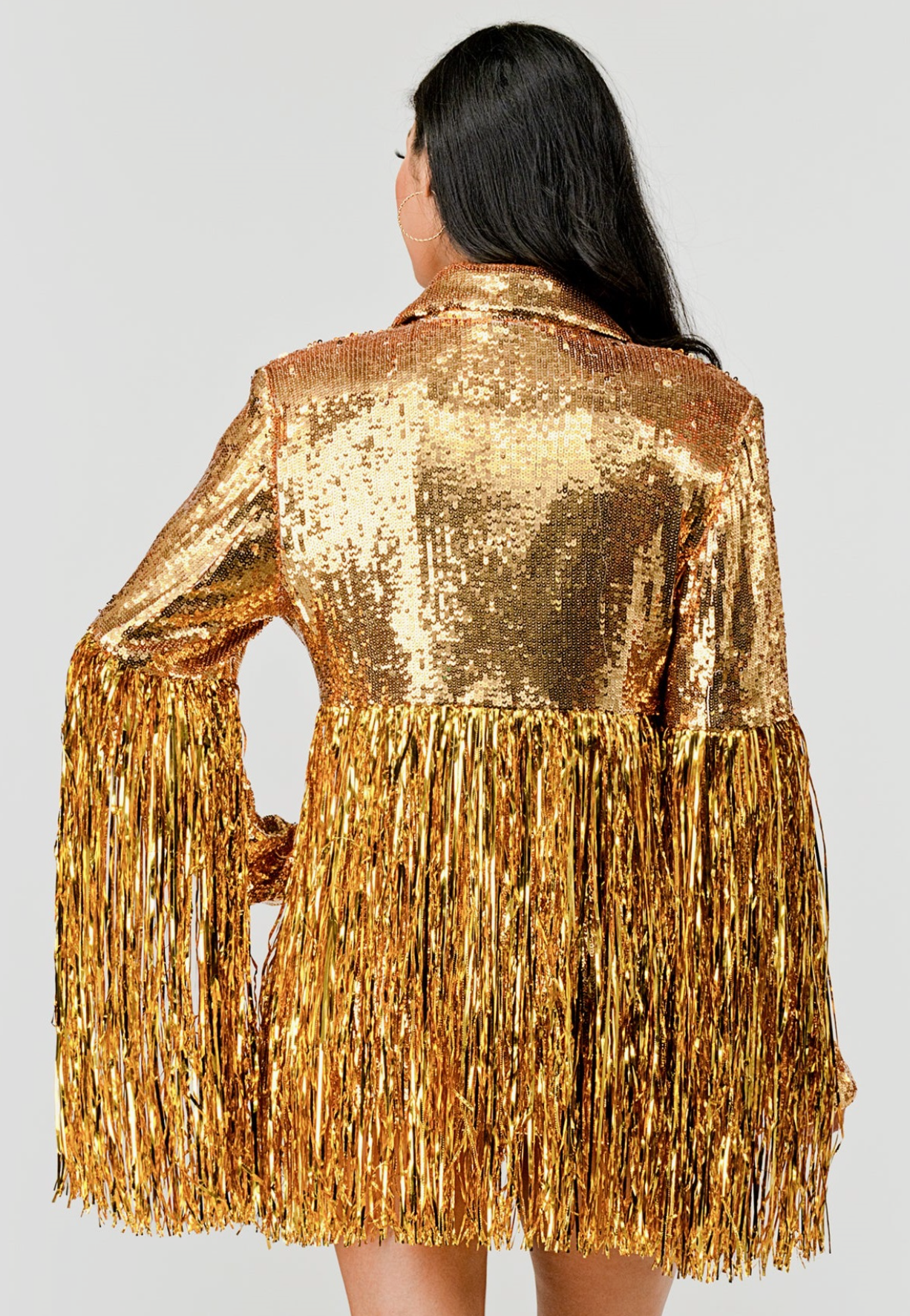 Long Sleeve Fringe Hem Sequin Blazer Gold