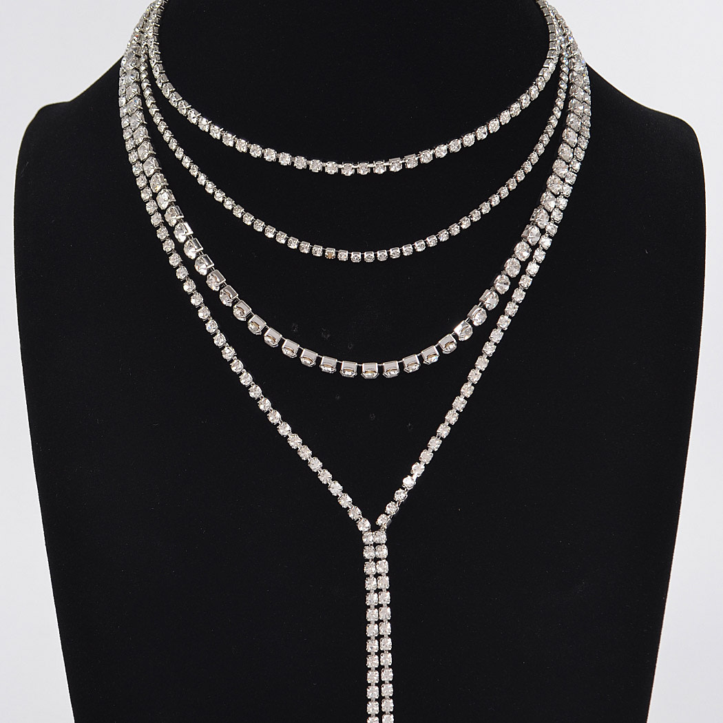 Multi-Layered Rhinestone Long Necklace Silver