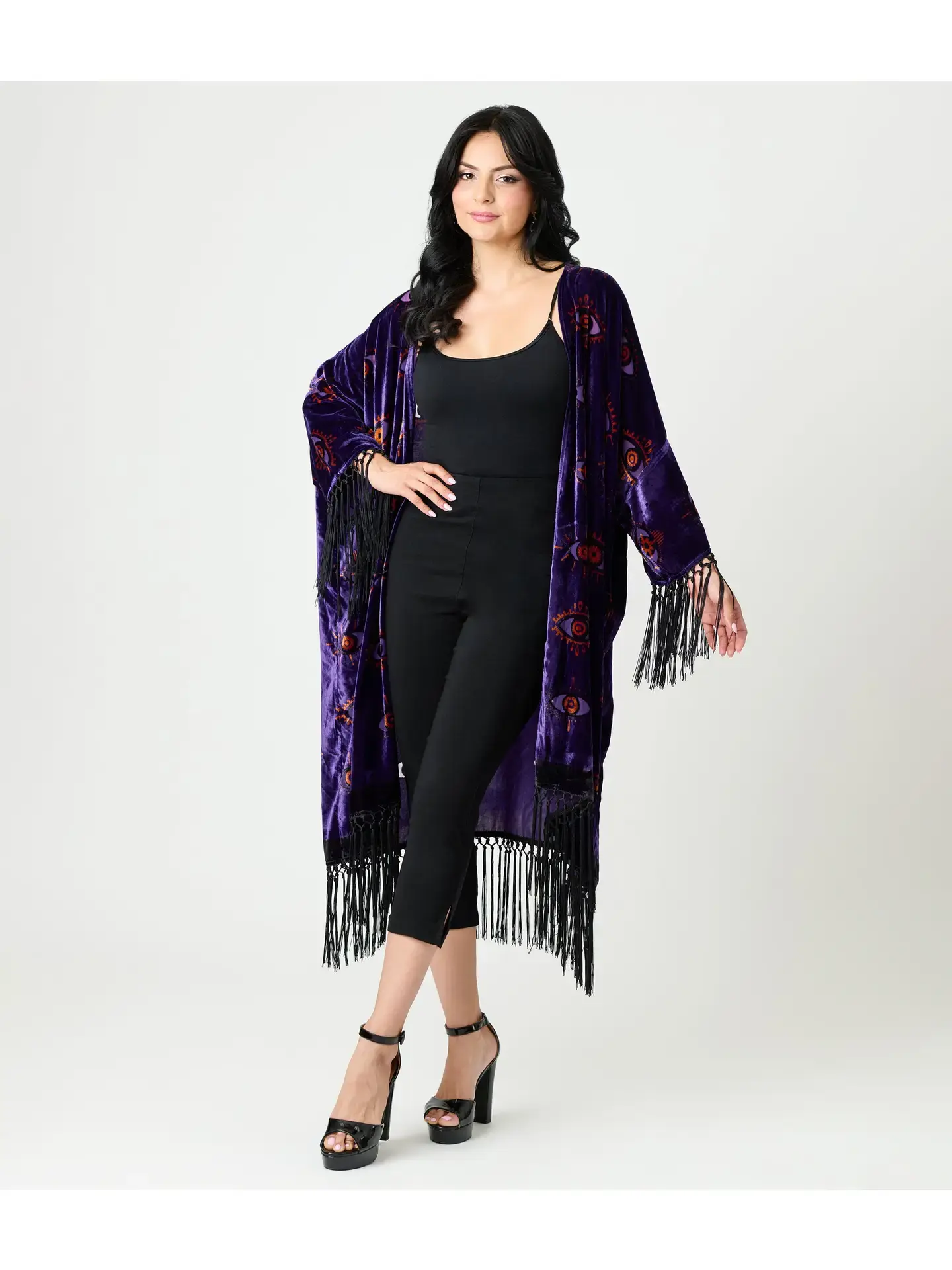 Plus Size Vintage Evil Eye Burnout Fringe Kimono Purple