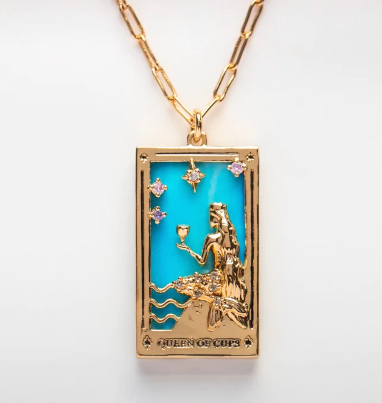 Steel 14k Gold Hand Engraved Tarot Card Necklace Queen of Cups