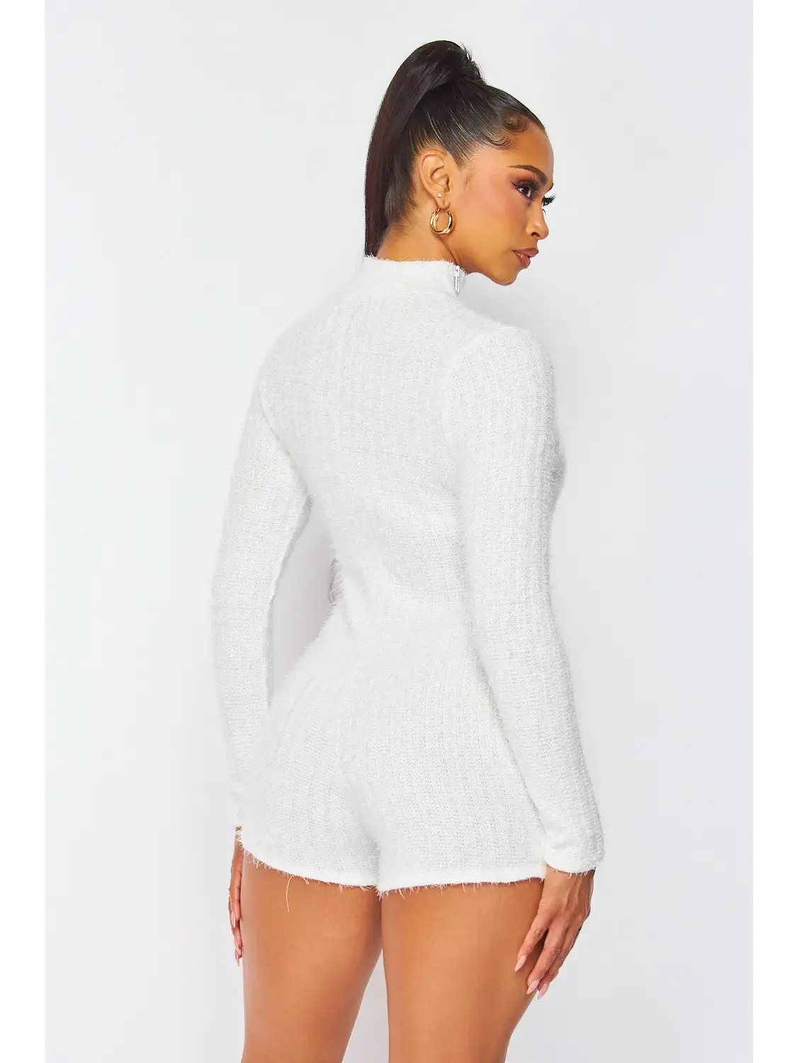 Zipper Detailed Long Sleeve Fuzzy Romper White
